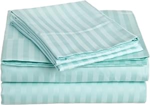 Product Description : Size: Queen | Color: Light BlueSilky soft 500 count stripe sateen sheet set made of single ply ultra soft 100-percent egyptian cotton yarn woven on state of the art air jet looms to give you comfortable sleep and long wear. The queen size light blue color flat sheet and pillow cases are finished with a 4-inch hem and the fully elastic fitted sheet stays secure on a mattress up to 18-inch thick. These sheets are easy care: wash in lukewarm water; tumble dry on low heat.