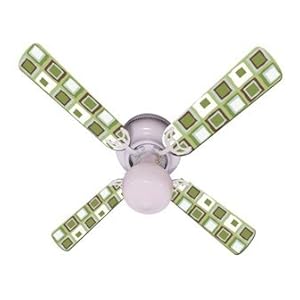 Product Description : Add a designer touch to your child's retro theme bedroom using the Millennium Sage ceiling fan. The fan blades feature retro squares in pleasing colors of sage, avocado, white and chocolate brown. The hand crafted Millennium Sage 42" Hugger Ceiling Fan with Schoolhouse Style Light is perfect for a bedroom or playroom. It has a convenient three speed switch for year round comfort. Summer-forward air motion creates cooling breeze and winter-reverse air flow recirculates rising warm air. The white glass light use a 60W candelabra bulb. The Millennium Sage ceiling fan comes with a 15 year manufacturer's warranty. For indoor use only. Measures 12.5 " from ceiling to bottom of fan 120 volt, 3-speed reversible motor Dual-capacitor speed control Double seal bearings for quiet smooth operation Self aligning blade arm eliminating any wobble Forward & reverse switch Uses single 60 watt candelabra bulb (not included)